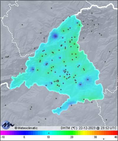 | 22-12-2023 | | | Máx. | Mín. | | | Temperatura | 12,5 | 1,9 | °C | | Humedad | 95 | 57 | % | | Viento | 6 | n/a | km/h | | Presión | 1.034 | 1.029 | hPa | | Precipitación | 0,0 | mm |
