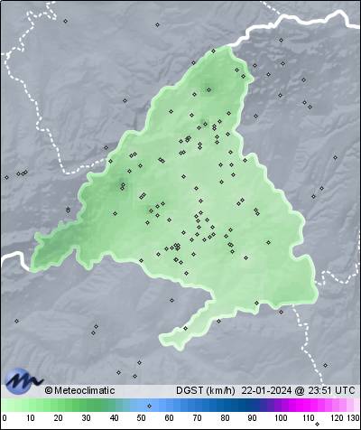 | 22-01-2024 | | | Máx. | Mín. | | | Temperatura | 12,4 | -0,8 | °C | | Humedad | 95 | 54 | % | | Viento | 16 | n/a | km/h | | Precipitación | 0,0 | mm |