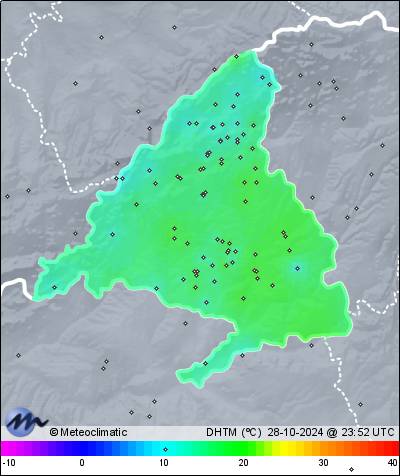 | 28-10-2024 | | | Máx. | Mín. | | | Temperatura | 12,3 | 9,6 | °C | | Humedad | 94 | 81 | % | | Viento | 7 | n/a | km/h | | Precipitación | 0,0 | mm |