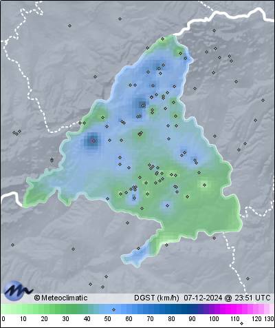 | 07-12-2024 | | | Máx. | Mín. | | | Temperatura | 12,0 | 2,3 | °C | | Humedad | 99 | 54 | % | | Viento | 44 | n/a | km/h | | Precipitación | 0,0 | mm |
