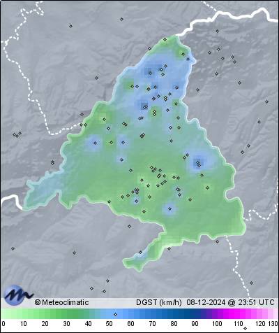 | 08-12-2024 | | | Máx. | Mín. | | | Temperatura | 8,3 | 3,6 | °C | | Humedad | 62 | 44 | % | | Viento | 48 | n/a | km/h | | Presión | 1.028 | 1.024 | hPa |