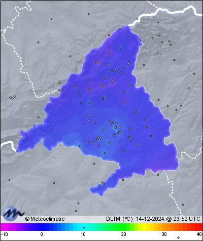 | 14-12-2024 | | | Máx. | Mín. | | | Temperatura | 9,3 | 0,1 | °C | | Humedad | 97 | 73 | % | | Viento | 18 | n/a | km/h | | Presión | 1.024 | 1.017 | hPa |