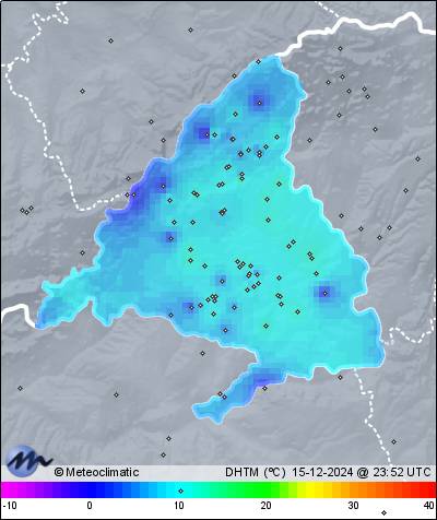 | 15-12-2024 | | | Máx. | Mín. | | | Temperatura | 10,0 | -7,9 | °C | | Humedad | 95 | 46 | % | | Viento | 18 | n/a | km/h | | Presión | 1.033 | 1.030 | hPa | | Precipitación | 0,0 | mm |