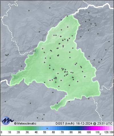 | 16-12-2024 | | | Máx. | Mín. | | | Temperatura | 17,1 | -5,7 | °C | | Humedad | 97 | 37 | % | | Viento | 6 | n/a | km/h | | Presión | 1.040 | 1.036 | hPa |