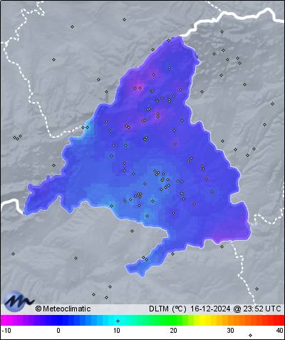 | 16-12-2024 | | | Máx. | Mín. | | | Temperatura | 9,9 | 1,9 | °C | | Humedad | 82 | 52 | % | | Precipitación | 0,0 | mm |