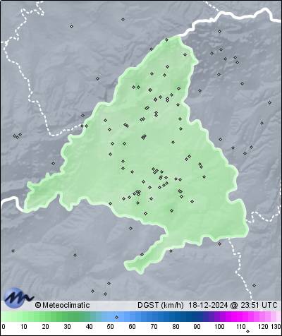 | 18-12-2024 | | | Máx. | Mín. | | | Temperatura | 10,9 | -2,2 | °C | | Humedad | 98 | 63 | % | | Viento | 7 | n/a | km/h | | Presión | 1.039 | 1.031 | hPa |