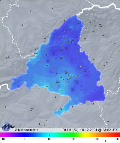 | 18-12-2024 | | | Máx. | Mín. | | | Temperatura | 12,9 | 2,6 | °C | | Humedad | 88 | 57 | % | | Viento | 6 | n/a | km/h | | Precipitación | 0,0 | mm |