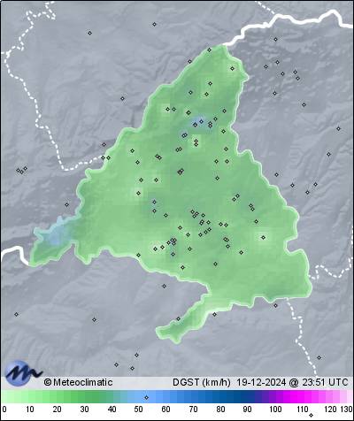 | 19-12-2024 | | | Máx. | Mín. | | | Temperatura | 14,1 | 6,9 | °C | | Humedad | 94 | 60 | % | | Viento | 34 | n/a | km/h | | Presión | 1.026 | 1.020 | hPa | | Precipitación | 0,0 | mm |