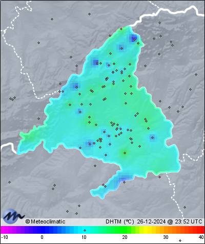 | 26-12-2024 | | | Máx. | Mín. | | | Temperatura | 15,4 | -1,7 | °C | | Humedad | 93 | 37 | % | | Viento | 10 | n/a | km/h | | Precipitación | 0,0 | mm |