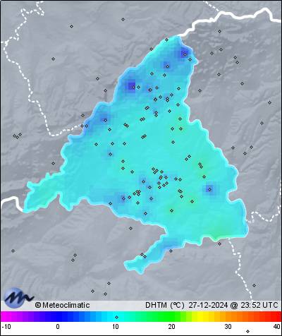 | 27-12-2024 | | | Máx. | Mín. | | | Temperatura | 14,3 | -2,5 | °C | | Humedad | 97 | 52 | % | | Viento | 6 | n/a | km/h | | Presión | 1.033 | 1.029 | hPa |