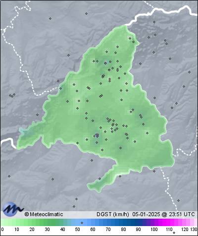 | 05-01-2025 | | | Máx. | Mín. | | | Temperatura | 5,5 | 2,1 | °C | | Humedad | 96 | 93 | % | | Viento | 30 | n/a | km/h | | Presión | 1.017 | 1.006 | hPa | | Precipitación | 22,5 | mm |