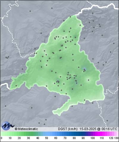 | 14-03-2025 | | | Máx. | Mín. | | | Temperatura | 6,1 | -3,1 | °C | | Humedad | 98 | 53 | % | | Viento | 26 | n/a | km/h | | Presión | 1.011 | 999 | hPa | | Precipitación | 0,0 | mm |