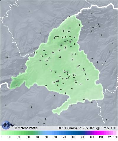 | 25-03-2025 | | | Máx. | Mín. | | | Temperatura | 15,9 | 5,6 | °C | | Humedad | 90 | 46 | % | | Viento | 26 | n/a | km/h | | Presión | 1.022 | 1.020 | hPa | | Precipitación | 0,0 | mm |