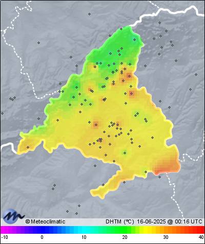 15-06-2025 | | Máx. | Mín. | | Temperatura | 34,3 | 18,8 | °C | Humedad | 68 | 19 | % | Viento | 32 | n/a | km/h | Presión | 1.019 | 1.013 | hPa | Precipitación | 0,0 | mm |