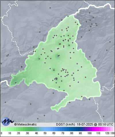 | 17-07-2025 | | | Máx. | Mín. | | | Temperatura | 38,2 | 22,8 | °C | | Humedad | 38 | 12 | % | | Viento | 32 | n/a | km/h | | Presión | 1.014 | 1.009 | hPa | | Precipitación | 0,0 | mm |