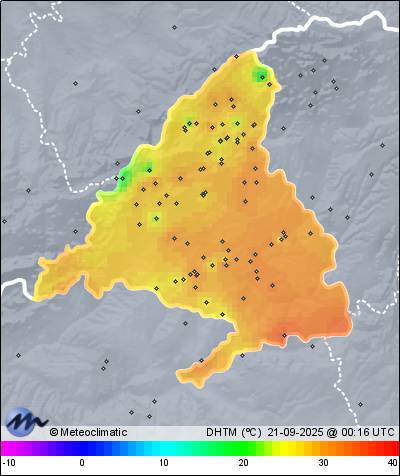 20-09-2025 | | Máx. | Mín. | | Temperatura | 28,7 | 15,5 | °C | Humedad | 77 | 35 | % | Viento | 33 | n/a | km/h | Presión | 1.018 | 1.009 | hPa | Precipitación | 0,0 | mm |