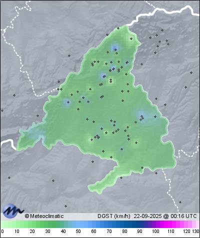 21-09-2025 | | Máx. | Mín. | | Temperatura | 22,1 | 9,6 | °C | Viento | 24 | n/a | km/h | Presión | 1.017 | 1.011 | hPa | Precipitación | 0,0 | mm |