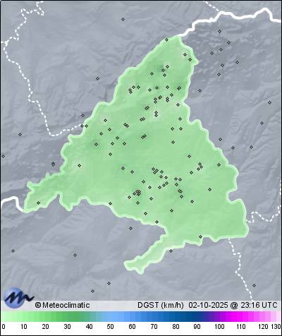 Actualizado: 21:34 UTC | 9,5°C 69% | 28,4 °C / 92% | 1,7°C / 29% | | Calma | 11 km/h | 1.022 hPa |
