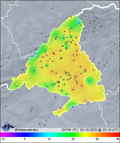 Actualizado: 21:43 UTC | 10,3°C 55% | 27,6 °C / 84% | 4,5°C / 20% | | Calma | 17 km/h | 1.023 hPa |