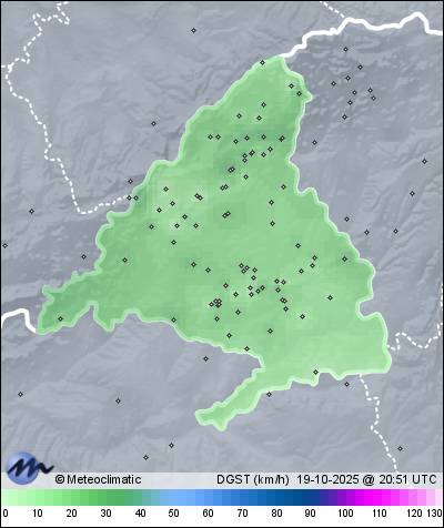Actualizado: 18:10 UTC | 19,3°C 53% | 22,9 °C / 80% | 9,6°C / 40% | | Calma | 16 km/h | 1.012 hPa |