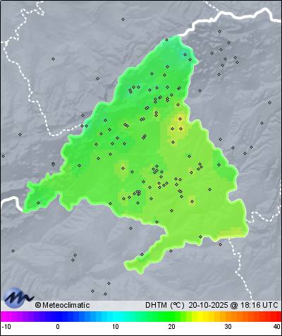 Actualizado: 15:00 UTC | 16,9°C 39% | 18,1 °C / 92% | 11,4°C / 39% | | 11 km/h WNW | 29 km/h | 1.012 hPa | 0,5 mm |