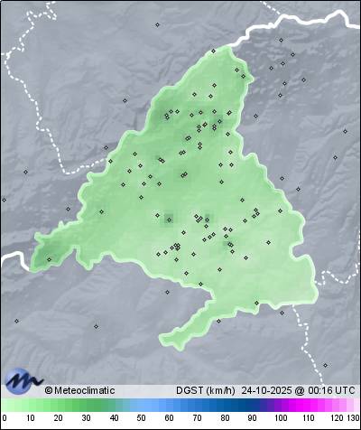 | 23-10-2025 | | | Máx. | Mín. | | | Temperatura | 17,8 | 12,1 | °C | | Humedad | 97 | 30 | % | | Viento | 44 | n/a | km/h | | Presión | 1.019 | 1.013 | hPa | | Precipitación | 0,8 | mm |
