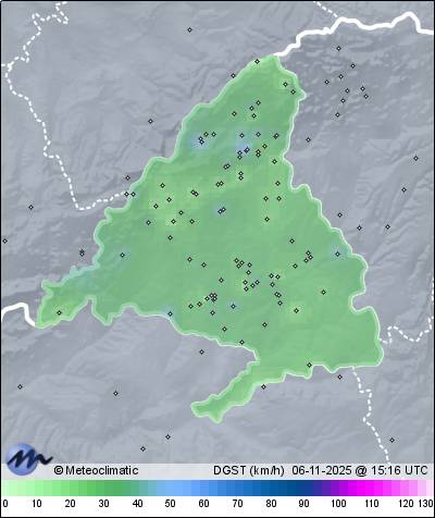 | Actualizado: 12:47 UTC | 9,3°C 78% | 10,1 °C / 96% | | 5,7°C / 77% | | 3 km/h WSW | | 16 km/h | | 1.015 hPa | | 0,3 mm |