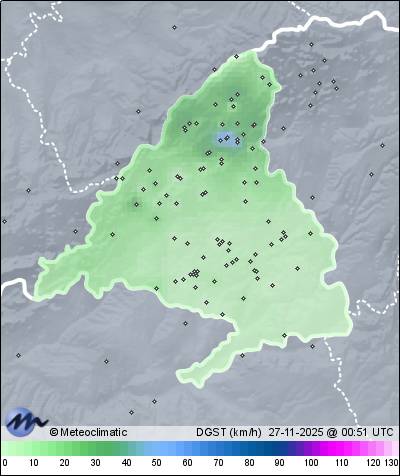 | 27-11-2025 | | | Máx. | Mín. | | | Temperatura | 8,1 | 1,4 | °C | | Humedad | 75 | 49 | % | | Viento | 40 | n/a | km/h | | Presión | 1.028 | 1.024 | hPa | | Precipitación | 0,0 | mm |