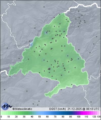 | Actualizado: 03:45 UTC | 6,2°C 92% | 6,3 °C / 93% | | 5,8°C / 88% | | 1 km/h SE | | 14 km/h | | 1.009 hPa | | 2,6 mm |