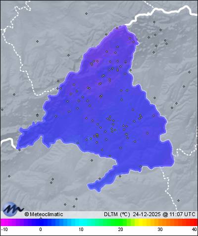| Actualizado: 08:49 UTC | 4,4°C 85% | 5,1 °C / 89% | | 3,2°C / 85% | | 2 km/h N | | 13 km/h | | 1.012 hPa |