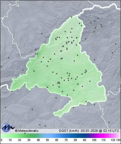 | Actualizado: 00:34 UTC | 8,5°C 84% | 10,4 °C / 99% |  | | 3,8°C / 78% | | 1 km/h N | | 18 km/h | | 1.006 hPa |