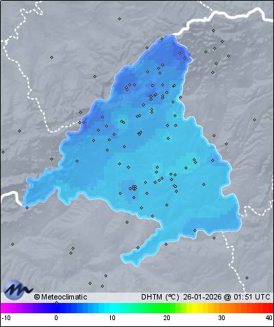 | Actualizado: 00:29 UTC | 3,9°C 69% | 4,0 °C / 69% | | 3,8°C / 67% | | 10 km/h NW | | 46 km/h | | 1.008 hPa |