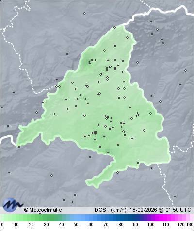 | Actualizado: 00:13 UTC | 6,1°C 95% | 6,2 °C / 95% | | 5,3°C / 95% | | Calma | | 2 km/h | | 1.019 hPa |