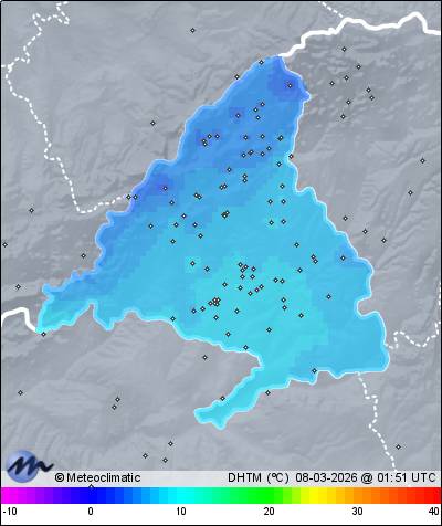 | Actualizado: 00:28 UTC | 4,2°C 90% | 5,0 °C / 96% | | 3,6°C / 85% | | Calma | | 7 km/h | | 1.025 hPa |