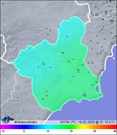 | Lo Pagan-S. Pedro Pinatar | 13 | 16,3 | 18,2 | 13,2 | 71 | 71 | 52 | 1.021 | 1.023 | 1.021 | 7 SSE | 33 | - | 87,0 | |