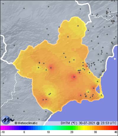 | 30-07-2021 | | | Máx. | Mín. | | | Temperatura | 39,8 | 23,3 | °C | | Humedad | 84 | 17 | % | | Viento | 23 | n/a | km/h | | Presión | 1.012 | 1.006 | hPa | | Precipitación | 0,0 | mm |