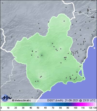 | 21-08-2021 | | | Máx. | Mín. | | | Temperatura | 32,0 | 23,4 | °C | | Humedad | 80 | 34 | % | | Viento | 34 | n/a | km/h | | Presión | 1.020 | 1.017 | hPa | | Precipitación | 0,0 | mm |