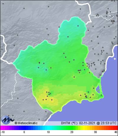 | 02-11-2021 | | | Máx. | Mín. | | | Temperatura | 22,1 | 13,7 | °C | | Humedad | 70 | 36 | % | | Viento | 35 | n/a | km/h | | Presión | 1.013 | 1.007 | hPa | | Precipitación | 0,0 | mm |