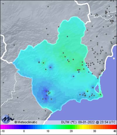 | 09-01-2022 | | | Máx. | Mín. | | | Temperatura | 22,0 | 7,9 | °C | | Humedad | 65 | 20 | % | | Viento | 31 | n/a | km/h | | Presión | 1.024 | 917 | hPa | | Precipitación | 0,0 | mm |