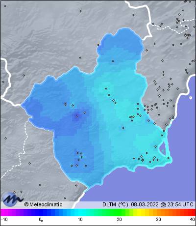 | 08-03-2022 | | | Máx. | Mín. | | | Temperatura | 17,6 | 6,6 | °C | | Humedad | 95 | 45 | % | | Viento | 32 | n/a | km/h | | Presión | 1.020 | 1.016 | hPa | | Precipitación | 0,0 | mm |