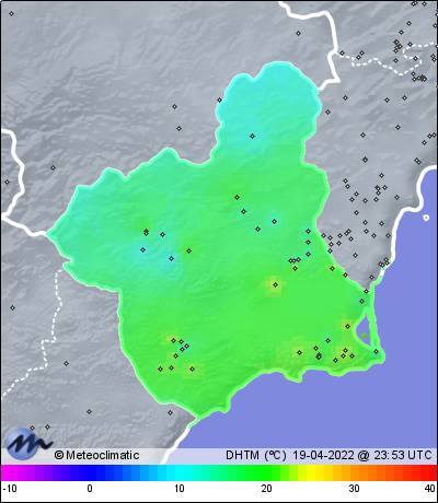 | 19-04-2022 | | | Máx. | Mín. | | | Temperatura | 23,1 | 13,3 | °C | | Humedad | 97 | 55 | % | | Viento | 28 | n/a | km/h | | Presión | 1.013 | 1.005 | hPa | | Precipitación | 0,0 | mm |