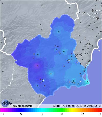 | 02-03-2023 | | | Máx. | Mín. | | | Temperatura | 10,4 | -0,8 | °C | | Humedad | 60 | 32 | % | | Viento | 39 | n/a | km/h | | Presión | 1.021 | 1.016 | hPa | | Precipitación | 0,0 | mm |