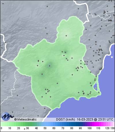 | 16-03-2023 | | | Máx. | Mín. | | | Temperatura | 22,3 | 6,4 | °C | | Humedad | 80 | 28 | % | | Viento | 45 | n/a | km/h | | Presión | 1.016 | 1.011 | hPa | | Precipitación | 0,0 | mm |