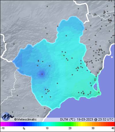 | 19-03-2023 | | | Máx. | Mín. | | | Temperatura | 19,2 | 12,6 | °C | | Humedad | 90 | 44 | % | | Viento | 30 | n/a | km/h | | Presión | 1.023 | 1.015 | hPa | | Precipitación | 0,0 | mm |