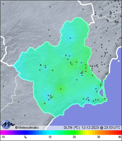 | 12-12-2023 | | | Máx. | Mín. | | | Temperatura | 23,5 | 9,2 | °C | | Humedad | 92 | 35 | % | | Viento | 30 | n/a | km/h | | Presión | 1.013 | 1.008 | hPa | | Precipitación | 0,0 | mm |