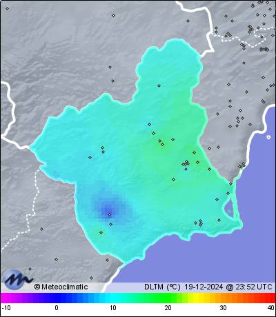 | 19-12-2024 | | | Máx. | Mín. | | | Temperatura | 22,7 | 6,8 | °C | | Humedad | 93 | 23 | % | | Viento | 26 | n/a | km/h | | Presión | 1.034 | 1.020 | hPa | | Precipitación | 0,0 | mm |