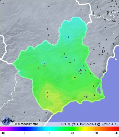 | 19-12-2024 | | | Máx. | Mín. | | | Temperatura | 22,7 | 6,8 | °C | | Humedad | 93 | 23 | % | | Viento | 26 | n/a | km/h | | Presión | 1.034 | 1.020 | hPa | | Precipitación | 0,0 | mm |