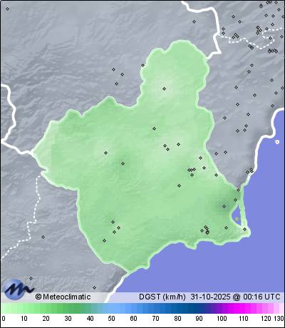 | Act. | Máx. | Mín. | Act. | Máx. | Mín. | Act. | Máx. | Mín. | Act. | Máx.  | Hoy | Año |  |  | Archena | 120 | n/a | 28,3 | 17,3 | n/a | 84 | 40 | n/a | 1.016 | 1.010 | n/a | 45 | - | 321,1 |  |  |  | Dolores (Torre Pacheco) | 40 | n/a | 26,9 | 15,8 | n/a | 94 | 46 | n/a | 1.014 | 1.007 | n/a | 37 | - | 357,9 |  |  |  | La Espada-Molina Segura | 194 | n/a | 25,8 | 16,5 | n/a | 83 | 55 | n/a | 1.015 | 1.008 | n/a | 37 | - | 255,4 |  |  |  | Murcia - P.Tocinos | 43 | n/a | 26,9 | 18,6 | n/a | 83 | 39 | n/a | 1.016 | 1.009 | n/a | 36 | - | 330,0 |  |  |  | Alquerias - Los Ramos | 42 | n/a | 27,6 | 17,3 | n/a | 81 | 40 | n/a | 1.015 | 1.008 | n/a | 32 | - | 249,0 |  |  |  | Ulea | 125 | n/a | 30,3 | 16,0 | n/a | 79 | 37 | n/a | 1.019 | 1.010 | n/a | 31 | - | 324,6 |  |  |  | Santomera | 41 | n/a | 28,0 | 17,3 | n/a | 87 | 38 | n/a | 1.016 | 1.010 | n/a | 27 | - | 259,6 |  |  |  | Cartagena - Los Barreros | 42 | n/a | 26,2 | 17,2 | n/a | 93 | 54 | n/a | 1.017 | 1.010 | n/a | 26 | - | 374,2 |  |  |  | Cartagena-Avda. Nueva CT | 33 | n/a | 25,8 | 16,8 | n/a | 91 | 49 | n/a | 1.017 | 1.010 | n/a | 26 | - | 338,3 |  |  |  | Cartagena-U.Mediterraneo | 26 | n/a | 26,3 | 17,9 | n/a | 87 | 50 | n/a | 1.016 | 1.009 | n/a | 26 | - | 368,4 |  |  |  | Jumilla | 520 | n/a | 22,6 | 14,1 | n/a | 78 | 51 | n/a | 1.016 | 1.010 | n/a | 26 | - | 191,4 |  |  |  | Lo Pagan-S. Pedro Pinatar | 13 | n/a | 25,8 | 17,3 | n/a | 88 | 51 | n/a | 1.021 | 1.014 | n/a | 26 | - | 360,9 |  |  |  | Murcia - San Antón | 42 | n/a | 28,1 | 17,3 | n/a | 89 | 42 | n/a | 1.016 | 1.009 | n/a | 26 | - | 368,2 |  |  |  | S. El Mayor/San PIO X | 55 | n/a | 28,7 | 17,5 | n/a | 84 | 34 | n/a | 1.017 | 1.010 | n/a | 26 | - | 198,1 |  |  |  | Canteras-Cañadas S. Pedro | 137 | n/a | 26,3 | 15,0 | n/a | 93 | 47 | n/a | 1.018 | 1.011 | n/a | 24 | - | 411,6 |  |  |  | Cieza | 188 | n/a | 27,1 | 15,5 | n/a | 89 | 42 | n/a | 1.015 | 1.009 | n/a | 24 | - | 217,0 |  |  |  | Cieza - San Jose Obrero | 188 | n/a | 27,4 | 15,0 | n/a | 95 | 46 | n/a | 1.017 | 1.010 | n/a | 24 | - | 249,5 |  |  |  | Lorca - LasViñas | 356 | n/a | 25,5 | 13,3 | n/a | 94 | 45 | n/a | 1.016 | 1.009 | n/a | 24 | - | 434,4 |  |  |  | Bullas - Rio Puente | 602 | n/a | 22,3 | 11,1 | n/a | 91 | 55 | n/a | 1.016 | 1.010 | n/a | 23 | 0,2 | 592,4 |  |  |  | Cartagena-Pol. Santa Ana | 51 | n/a | 25,3 | 16,4 | n/a | 85 | 53 | n/a | 1.015 | 1.008 | n/a | 23 | - | 397,2 |  |  |  | La Manga del Mar Menor | 3 | n/a | 24,4 | 18,6 | n/a | 93 | 59 | n/a | 1.021 | 1.014 | n/a | 23 | - | 285,2 |  |  |  | El Algar | 52 | n/a | 26,6 | 16,7 | n/a | 92 | 44 | n/a | 1.020 | 1.013 | n/a | 22 | - | 359,1 |  |  |  | Murcia - B.º del Progreso | 46 | n/a | 27,6 | 16,8 | n/a | 92 | 41 | n/a | 1.017 | 1.010 | n/a | 22 | - | 364,7 |  |  |  | Murcia - Centro | 70 | n/a | 28,2 | 18,2 | n/a | 81 | 38 | n/a | 1.016 | 1.009 | n/a | 21 | 0,3 | 395,2 |  |  |  | Puerto Lumbreras | 441 | n/a | 23,6 | 15,6 | n/a | 86 | 59 | n/a | 1.018 | 1.011 | n/a | 20 | - | 318,2 |  |  |  | Cehegín | 560 | n/a | 22,8 | 11,2 | n/a | 92 | 50 | n/a | 1.016 | 1.009 | n/a | 19 | - | 628,0 |  |  |  | Caravaca - La Encarnacion | 741 | n/a | 24,6 | 10,8 | n/a | 95 | 49 | n/a | 1.016 | 1.009 | n/a | 18 | - | 463,8 |  |  |  | Lorca - Cazalla | 307 | n/a | 25,8 | 15,7 | n/a | 94 | 51 | n/a | 1.016 | 1.009 | n/a | 18 | - | 312,6 |  |  |  | Cartagena | 39 | n/a | 26,4 | 17,1 | n/a | 89 | 47 | n/a | 1.017 | 1.010 | n/a | 17 | - | 354,1 |  |  |  | Lorca - Torrecilla | 307 | n/a | 25,2 | 13,6 | n/a | 96 | 54 | n/a | 1.021 | 1.013 | n/a | 17 | - | 366,3 |  |  |  | Murcia - Torreguil | 218 | n/a | 25,8 | 16,0 | n/a | 93 | 49 | n/a | 1.018 | 1.011 | n/a | 17 | 0,3 | 460,8 |  |  |  | Cartagena-Mol.Marfagones | 69 | n/a | 27,1 | 16,1 | n/a | 90 | 46 | n/a | 1.019 | 1.012 | n/a | 15 | x | x |  |  |  | Murcia - Santa Cruz | 35 | n/a | 24,2 | 24,2 | n/a | 67 | 67 | n/a | x | x | n/a | 10 | - | 283,5 |  |  |  | Cehegin - P. La Pollera | 595 | n/a | 19,0 | 13,1 | n/a | 84 | 62 | n/a | 1.017 | 1.010 | n/a | 3 | - | 638,4 |  |  |  | Santomera - La Almazara | 104 | n/a | 27,1 | 15,0 | n/a | 92 | 44 | n/a | 1.015 | 1.009 | x | x | - | 194,2 |  |