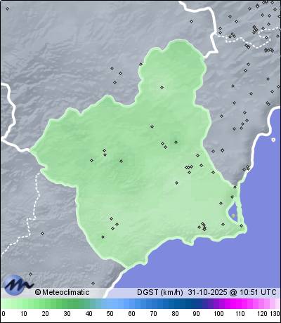 | Act. | Máx. | Mín. | Act. | Máx. | Mín. | Act. | Máx. | Mín. | Act. | Máx.  | Hoy | Año |  |  | Bullas - Rio Puente | 602 | 12,5 | 13,9 | 12,3 | 85 | 86 | 80 | 1.016 | 1.016 | 1.015 | - | 23 | - | 592,4 |  |  |  | Caravaca - La Encarnacion | 741 | 11,2 | 12,1 | 11,2 | 86 | 86 | 79 | 1.015 | 1.016 | 1.015 | 8 W | 18 | - | 463,8 |  |  |  | Cieza | 188 | 12,7 | 16,3 | 12,7 | 86 | 86 | 76 | 1.015 | 1.016 | 1.015 | 5 WNW | 15 | - | 217,0 |  |  |  | Ulea | 125 | 16,3 | 16,5 | 15,3 | 74 | 80 | 74 | 1.019 | 1.019 | 1.018 | 4 W | 14 | - | 324,6 |  |  |  | Puerto Lumbreras | 441 | 14,8 | 16,4 | 14,6 | 81 | 82 | 76 | 1.018 | 1.018 | 1.017 | 3 W | 13 | - | 318,2 |  |  |  | La Espada-Molina Segura | 194 | 15,3 | 17,1 | 14,9 | 74 | 80 | 74 | 1.014 | 1.015 | 1.014 | 5 NNW | 11 | - | 255,4 |  |  |  | Murcia - P.Tocinos | 43 | 16,4 | 18,5 | 16,4 | 86 | 87 | 82 | 1.015 | 1.016 | 1.015 | 4 SSW | 11 | - | 330,0 |  |  |  | Murcia - Centro | 70 | 16,4 | 18,8 | 16,3 | 84 | 86 | 81 | 1.016 | 1.016 | 1.015 | - | 10 | - | 395,2 |  |  |  | Murcia - Santa Cruz | 35 | 24,2 | 24,2 | 24,2 | 67 | 67 | 67 | x | x | x | 5 ESE | 10 | - | 283,5 |  |  |  | Santomera | 41 | 15,1 | 18,1 | 15,1 | 90 | 90 | 84 | 1.016 | 1.016 | 1.016 | - | 10 | - | 259,6 |  |  |  | Cieza - San Jose Obrero | 188 | 12,7 | 14,8 | 12,6 | 90 | 91 | 87 | 1.017 | 1.017 | 1.017 | 3 NNE | 9 | - | 249,5 |  |  |  | Jumilla | 520 | 11,8 | 15,0 | 11,8 | 79 | 83 | 73 | 1.016 | 1.016 | 1.016 | - | 8 | - | 191,4 |  |  |  | La Manga del Mar Menor | 3 | 17,4 | 18,9 | 17,4 | 94 | 95 | 93 | 1.021 | 1.021 | 1.021 | 3 W | 8 | - | 285,2 |  |  |  | Lorca - Cazalla | 307 | 13,2 | 16,5 | 13,2 | 92 | 93 | 88 | 1.016 | 1.016 | 1.016 | - | 8 | - | 312,6 |  |  |  | Cartagena | 39 | 15,1 | 17,3 | 14,9 | 93 | 93 | 85 | 1.017 | 1.017 | 1.016 | - | 7 | - | 354,1 |  |  |  | Lo Pagan-S. Pedro Pinatar | 13 | 17,2 | 17,3 | 16,8 | 92 | 92 | 88 | 1.020 | 1.021 | 1.020 | 6 NW | 7 | - | 360,9 |  |  |  | Archena | 120 | 15,2 | 17,3 | 14,8 | 86 | 88 | 84 | 1.016 | 1.016 | 1.016 | 2 W | 6 | - | 321,1 |  |  |  | Cartagena-Pol. Santa Ana | 51 | 15,8 | 16,6 | 15,7 | 87 | 87 | 83 | 1.015 | 1.015 | 1.014 | 2 WNW | 6 | - | 397,2 |  |  |  | Cehegin - P. La Pollera | 595 | 10,8 | 13,8 | 10,8 | 88 | 88 | 80 | 1.016 | 1.017 | 1.016 | - | 6 | - | 638,4 |  |  |  | Canteras-Cañadas S. Pedro | 137 | 13,6 | 14,8 | 13,3 | 100 | 100 | 95 | 1.017 | 1.018 | 1.017 | - | 5 | - | 411,4 |  |  |  | Cartagena-Avda. Nueva CT | 33 | 16,2 | 17,0 | 15,5 | 90 | 90 | 89 | 1.017 | 1.017 | 1.016 | 4 NNW | 5 | - | 338,3 |  |  |  | Cartagena-U.Mediterraneo | 26 | 16,9 | 17,7 | 16,1 | 86 | 87 | 85 | 1.016 | 1.016 | 1.016 | 2 N | 5 | - | 368,4 |  |  |  | Lorca - LasViñas | 356 | 11,6 | 14,0 | 11,6 | 92 | 92 | 91 | 1.016 | 1.017 | 1.016 | - | 5 | - | 434,4 |  |  |  | Murcia - San Antón | 42 | 15,5 | 17,6 | 15,5 | 90 | 92 | 88 | 1.016 | 1.016 | 1.015 | - | 5 | - | 368,2 |  |  |  | Cartagena - Los Barreros | 42 | 16,3 | 17,6 | 15,9 | 94 | 94 | 91 | 1.016 | 1.016 | 1.016 | 1 E | 4 | - | 374,2 |  |  |  | Cartagena-Mol.Marfagones | 69 | 15,5 | 16,9 | 15,1 | 92 | 92 | 84 | 1.019 | 1.019 | 1.018 | - | 4 | x | x |  |  |  | El Algar | 52 | 15,2 | 17,1 | 15,2 | 94 | 94 | 92 | 1.020 | 1.020 | 1.019 | - | 4 | - | 359,1 |  |  |  | Lorca - Torrecilla | 307 | 12,3 | 14,5 | 12,1 | 97 | 97 | 94 | 1.020 | 1.021 | 1.020 | 1 NNE | 4 | - | 366,3 |  |  |  | Murcia - B.º del Progreso | 46 | 14,7 | 17,0 | 14,7 | 95 | 95 | 90 | 1.017 | 1.017 | 1.016 | - | 4 | - | 364,7 |  |  |  | S. El Mayor/San PIO X | 55 | 15,5 | 17,9 | 15,5 | 87 | 87 | 81 | 1.017 | 1.017 | 1.016 | 3 SW | 4 | - | 198,1 |  |  |  | Murcia - Torreguil | 218 | 14,8 | 16,4 | 14,8 | 96 | 97 | 91 | 1.018 | 1.018 | 1.017 | - | 2 | - | 460,8 |  |  |  | Alquerias - Los Ramos | 42 | 14,6 | 16,7 | 14,6 | 85 | 86 | 82 | 1.015 | 1.015 | 1.015 | - | 0 | - | 249,0 |  |  |  | Dolores (Torre Pacheco) | 40 | 15,4 | 16,2 | 15,3 | 97 | 97 | 94 | 1.014 | 1.014 | 1.013 | - | 0 | - | 357,9 |  |  |  | Santomera - La Almazara | 104 | 13,4 | 15,7 | 13,1 | 93 | 93 | 89 | 1.015 | 1.016 | 1.015 | x | x | - | 194,2 |  |