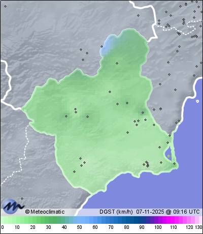 | Murcia - B.º del Progreso | 46 | 12,3 | 14,2 | 11,6 | 67 | 69 | 58 | 1.017 | 1.017 | 1.016 | 2 WNW | 7 | - | 364,7 | |